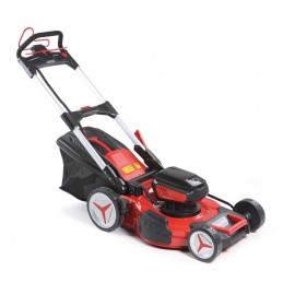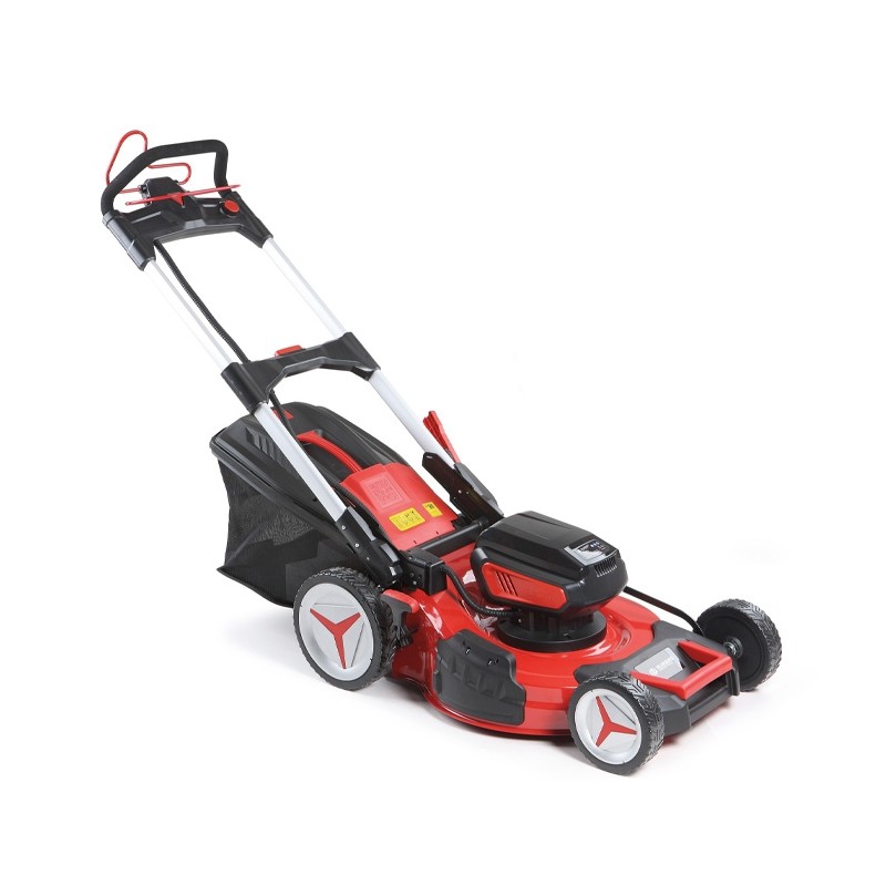 Tondeuse à gazon sans fil avec batterie lithium 40 Volts 2,5 Ah, autonomie jusqu’à 40 minutes et hauteur de coupe réglable de 30 à 80 mm en 5 positions. Équipée d’un moteur brushless et d’un indicateur LED de charge de la batterie.