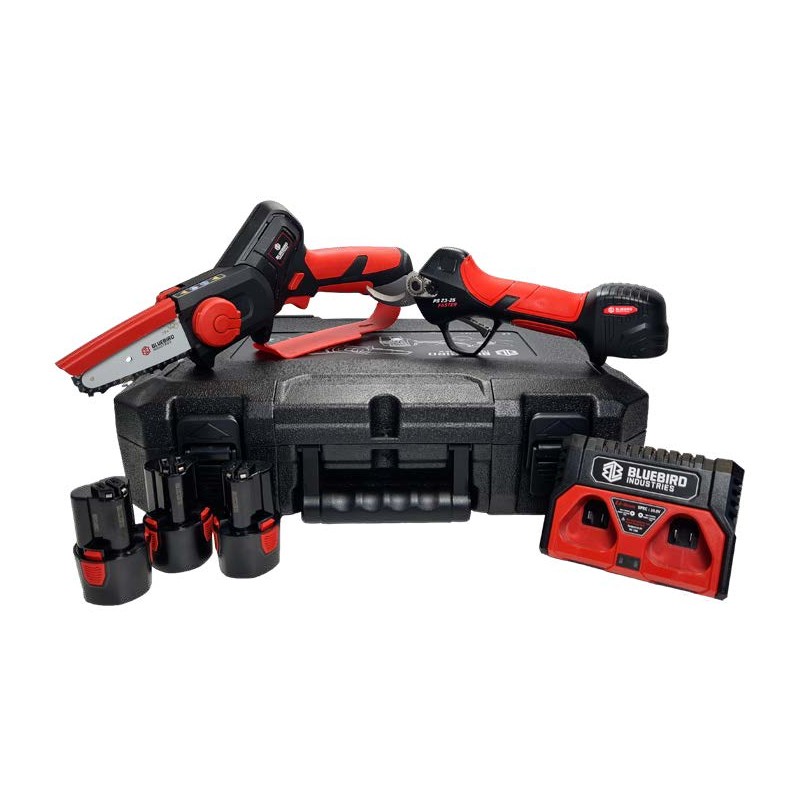 KIT offerta potatore + forbice Bluebird a batteria, adatto al taglio di arbusti, cespugli e rami fino ad una dimensione massima di 100 mm.